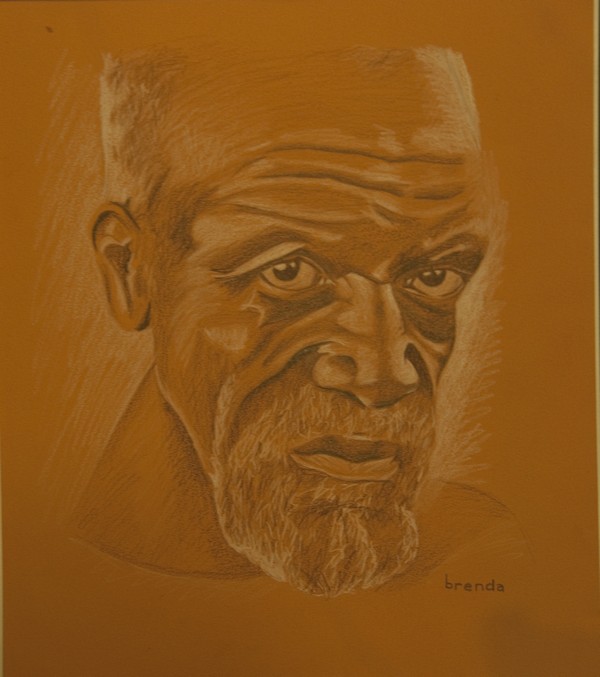 Homeless black man, brown and white pencil on orange paper.