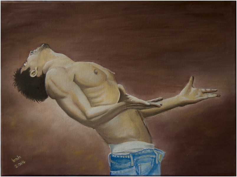 Painting of yummy topless young man with gorgeous muscles exuding energy and light.